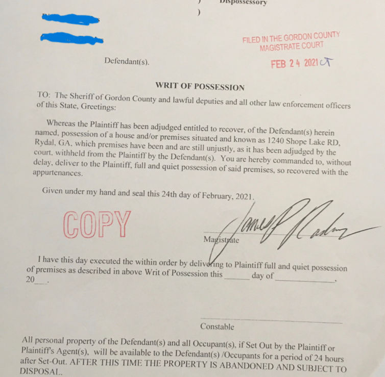 They said, “I have this piece of paper (pointing at the writ of possession taped to the door) that says that I have my house back and that all this stuff is mine.”